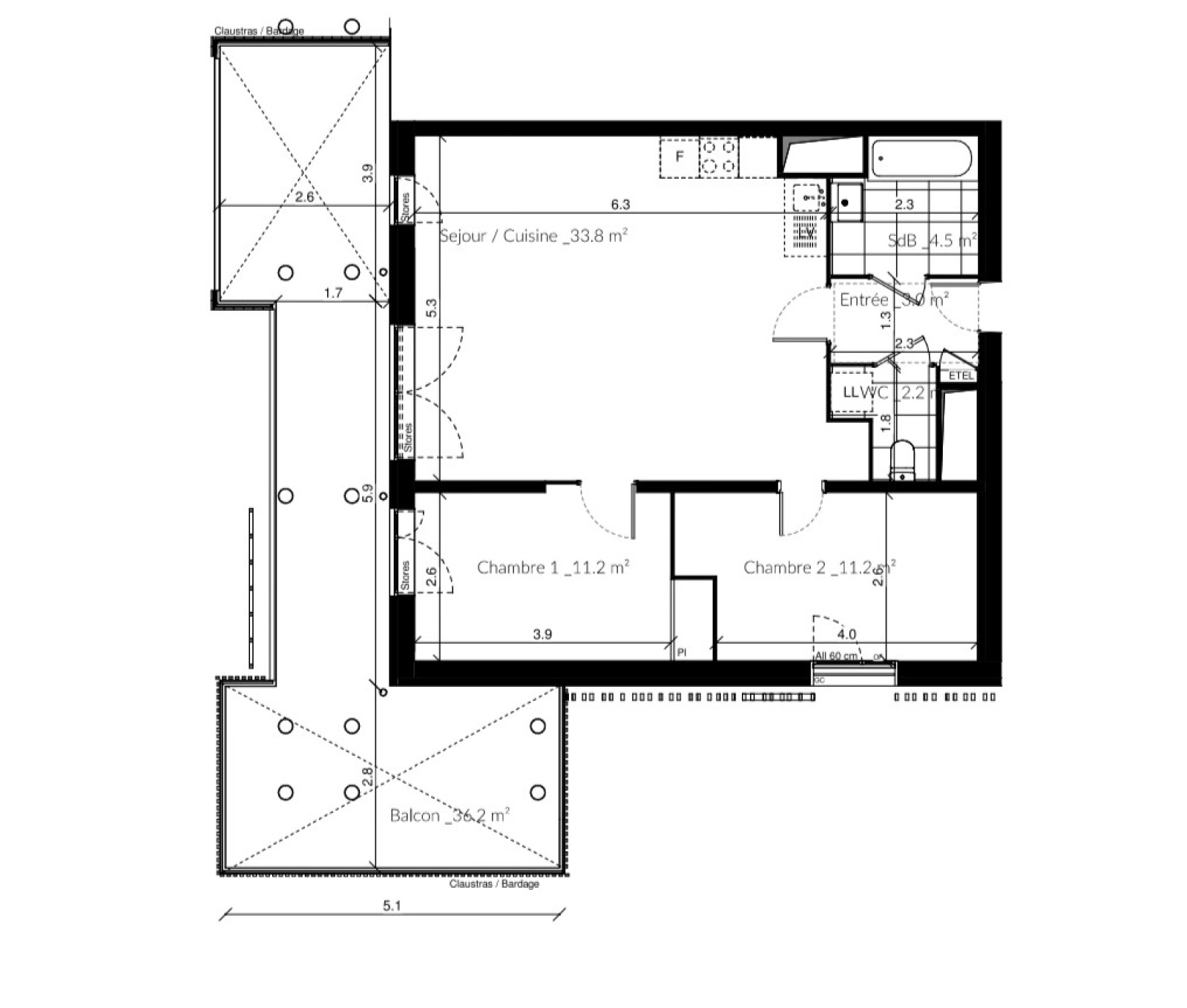Cet appartement 3P dernier étage exposé Sud se composera d'un séjour/cuisine ouvert sur un grand balcon de 36 m², de deux chambres et une salle de bains.