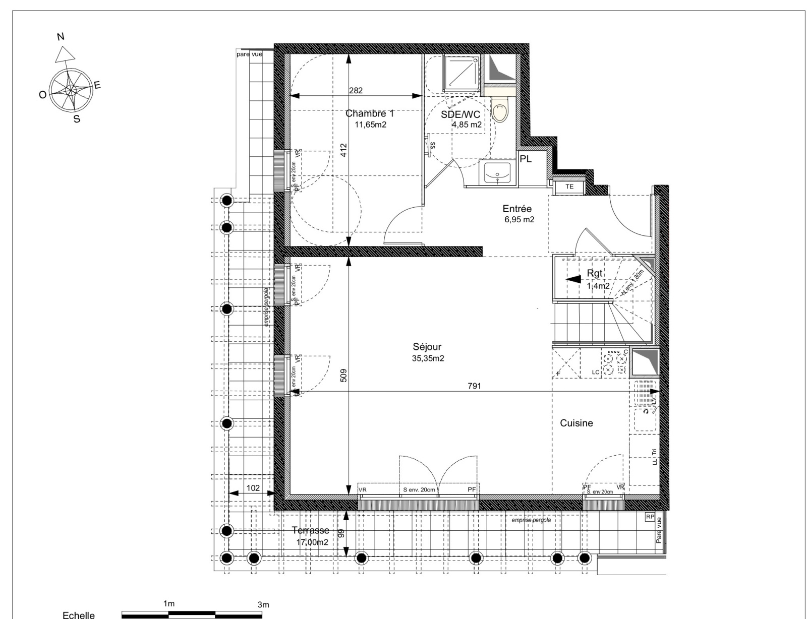 - au premier niveau, un séjour/cuisine ouvert sur une grande terrasse de 17 m², une chambre, une salle d'eau avec WC et un espace rangement