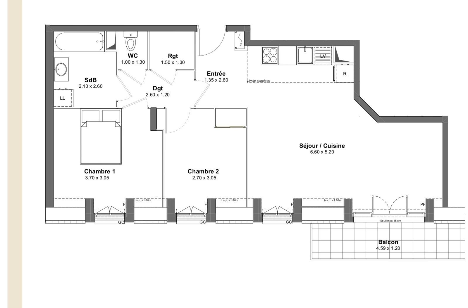 Dans un immeuble BBC, normes PMR, cet appartement 3P se composera d'un séjour/cuisine ouvert sur une terrasse, de deux chambres, d'une salle de bains et d'un espace de rangement.