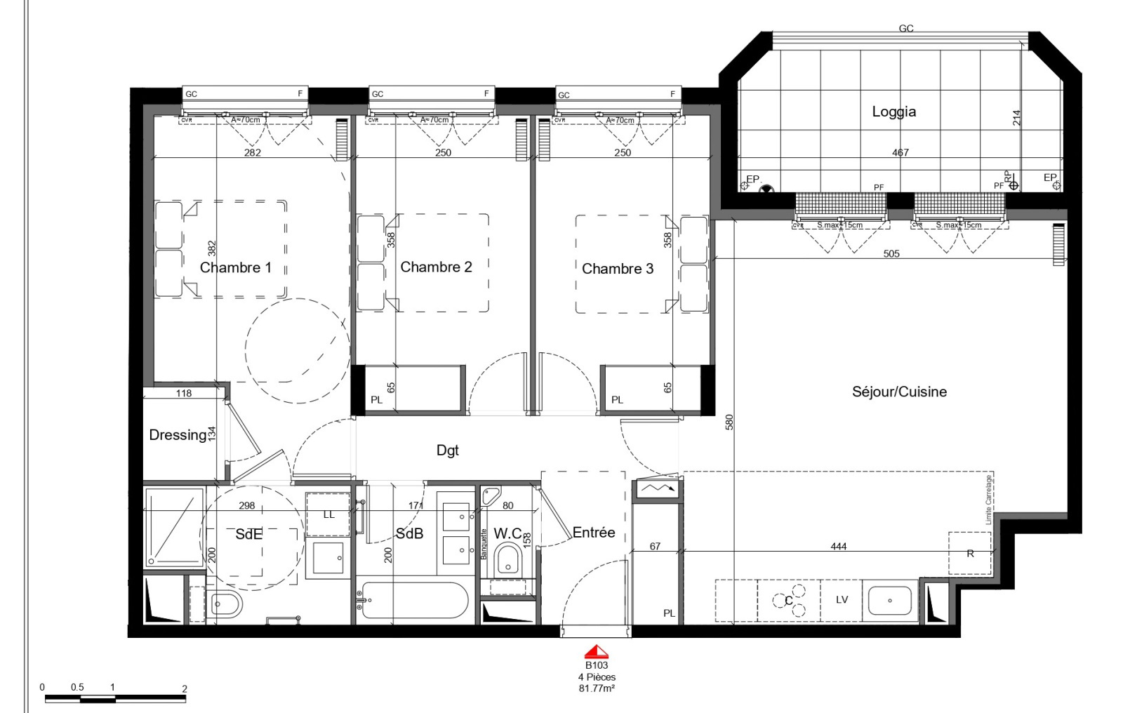 Dans un immeuble BBC, normes PMR, cet appartement 4P se composera d'un séjour/cuisine ouvert sur une loggia, de trois chambres, d'une salle de bains, d'une salle d'eau et d'un dressing.