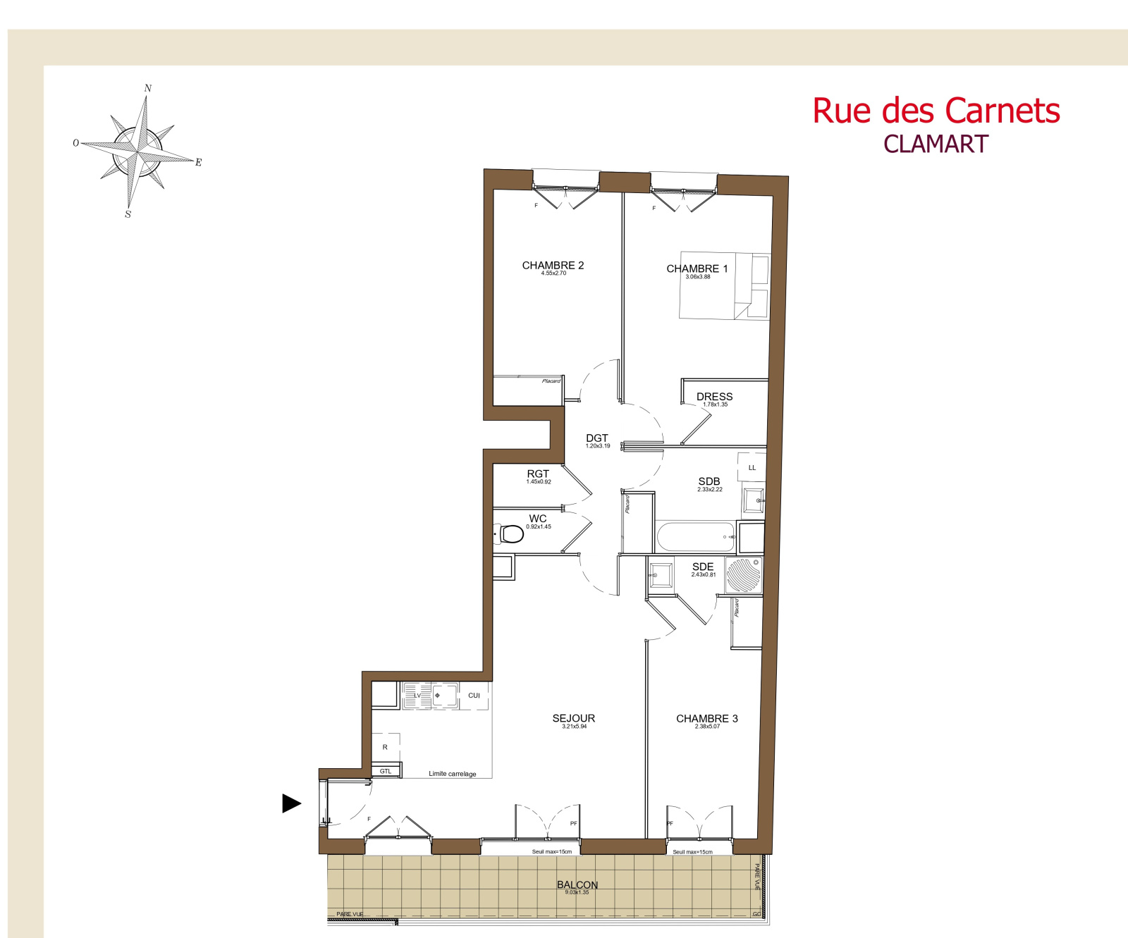 Dans un immeuble BBC, normes PMR, cet appartement 4P se compose d'un séjour/cuisine donnant sur un balcon de 12m², trois chambres, une salle de bains, une salle d'eau avec WC et un espace dressing.